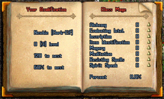 There is nothing dynamic or specific in my class system, this book displays a percentage from 0 to 150, on each page there is my own class and its skills, I can certainly throw you screenshots of each page if you are interested.ThisIsMe wrote: Fri Aug 30, 2019 10:19 am Well I'm not really sure what's going on in that screen shot, I have seen a similar skill book in WoD or Sanctuary and those were I know for a fact always made available for public use. So there'd be no issues with using those,the issue being that for what you're looking to do I don't believe which ever shard I originally saw it on (we're going back circa 2003) I don't recall having a class system.